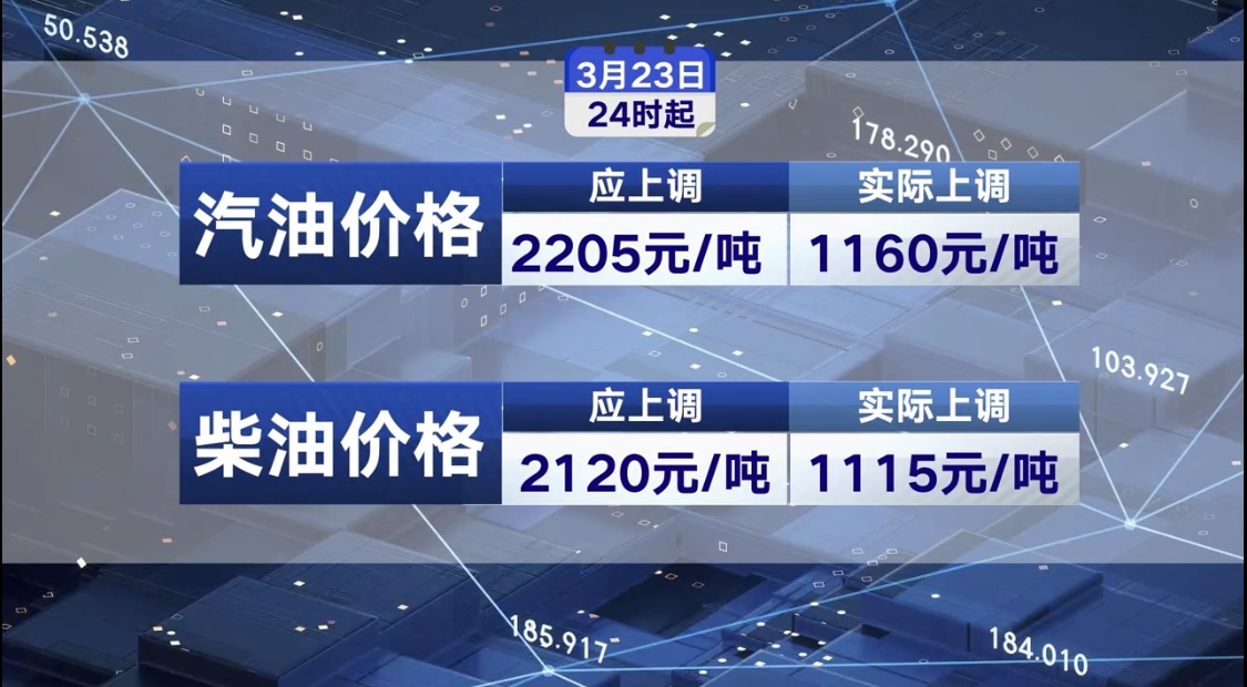 根據(jù)現(xiàn)行價格機(jī)制計(jì)算,3月23日24點(diǎn)起,國內(nèi)汽、柴油最高零售價格,每噸分別應(yīng)上調(diào)2205元、2120元,而調(diào)控后實(shí)際上調(diào)1160元、1115元。