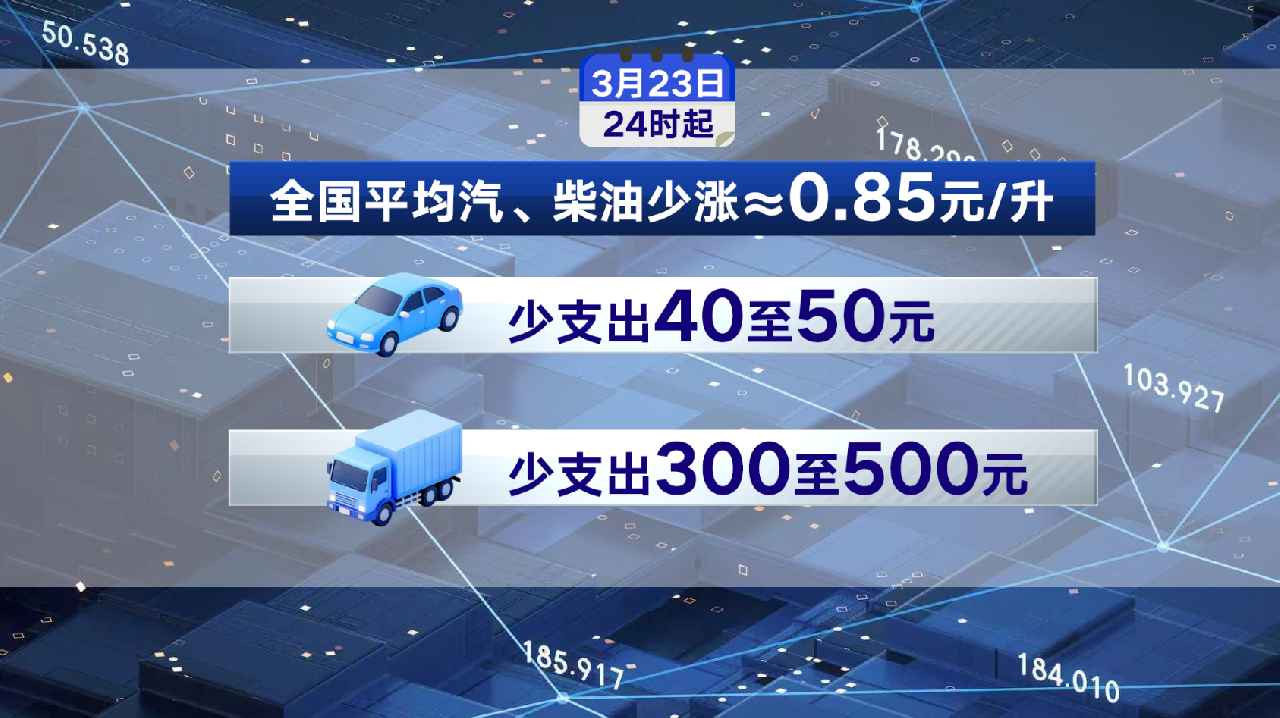 這相當(dāng)于全國平均汽、柴油每升少漲0.85元左右。對于私家車,按油箱50、60升測算,加滿一箱油可少支出40、50元。對于大貨車司機(jī),按油箱400到600升測算,加滿一箱油可少支出300到500元。