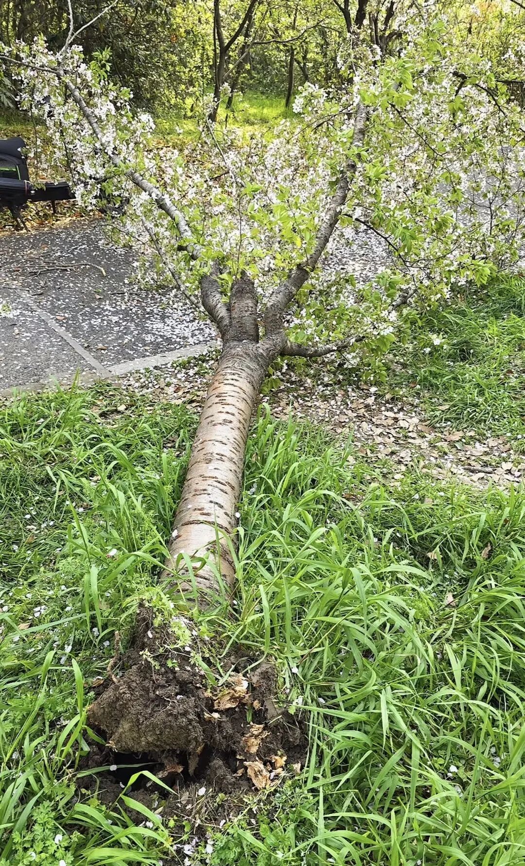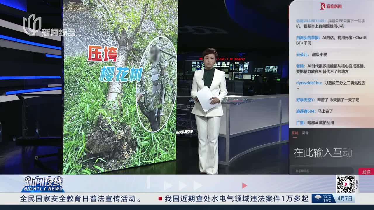 據(jù)了解,事發(fā)地點(diǎn)位于顧村公園收費(fèi)區(qū)域之外,是免費(fèi)開放的外環(huán)林帶。目前,園區(qū)工作人員已經(jīng)第一時間進(jìn)行處置,為這棵櫻花樹做扶正支撐,并對枝條進(jìn)行修剪,盡最大努力保障它能夠存活,樹根周圍已經(jīng)有新翻動的泥土。