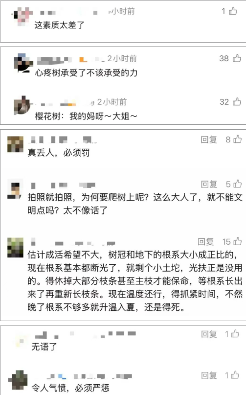 4月7日,坊記前往事發(fā)地核實(shí),一名工作人員證實(shí),4月6日下午,確有一名女子攀爬櫻花樹致樹木倒伏。