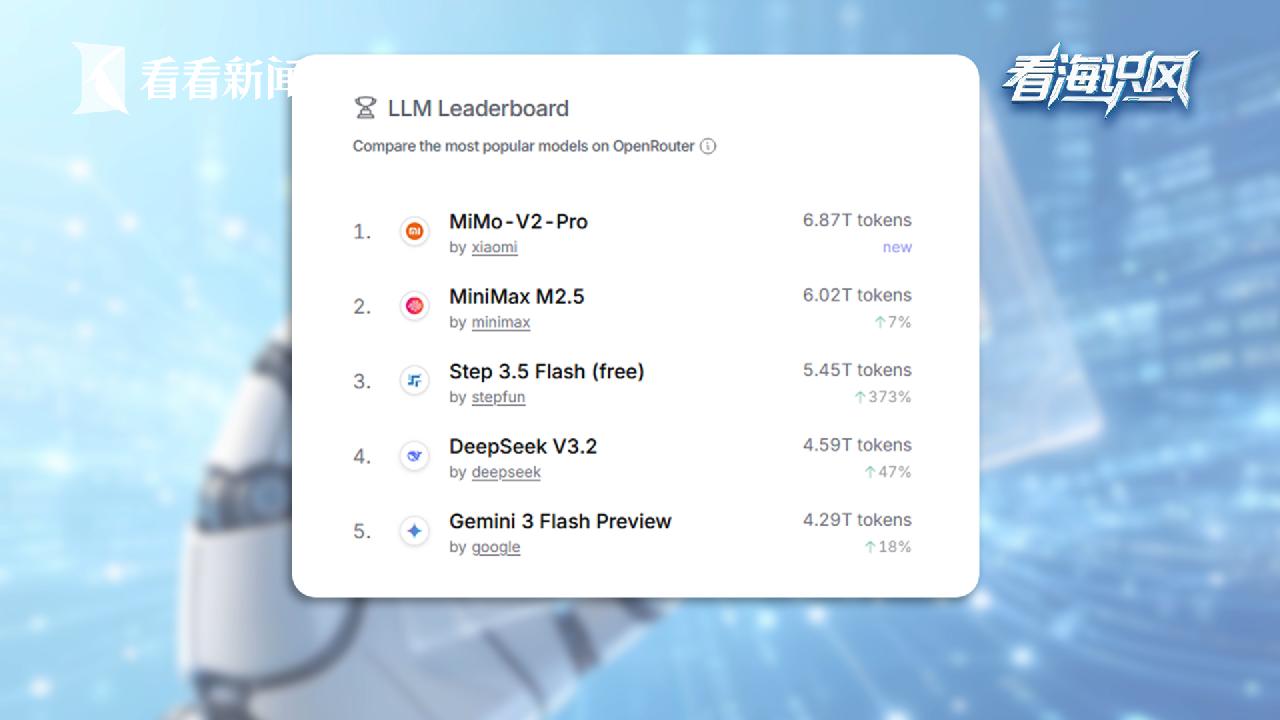 來自O(shè)penRouter的數(shù)據(jù)顯示,2026年3月,按照詞元消耗量來計算,全球排名前五的大模型里,前四名都來自中國,它們分別是:小米的MiMo、上海稀宇科技的MiniMax、上海階躍星辰的Step、深度求索的DeepSeek,排名第五的,才是谷歌的Gemini。