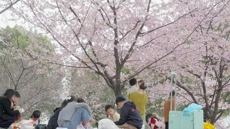 顧村公園內(nèi),層層疊疊的櫻花布滿枝頭。樹下,游客們帶著野餐墊,享受著城市里的“微度假”。