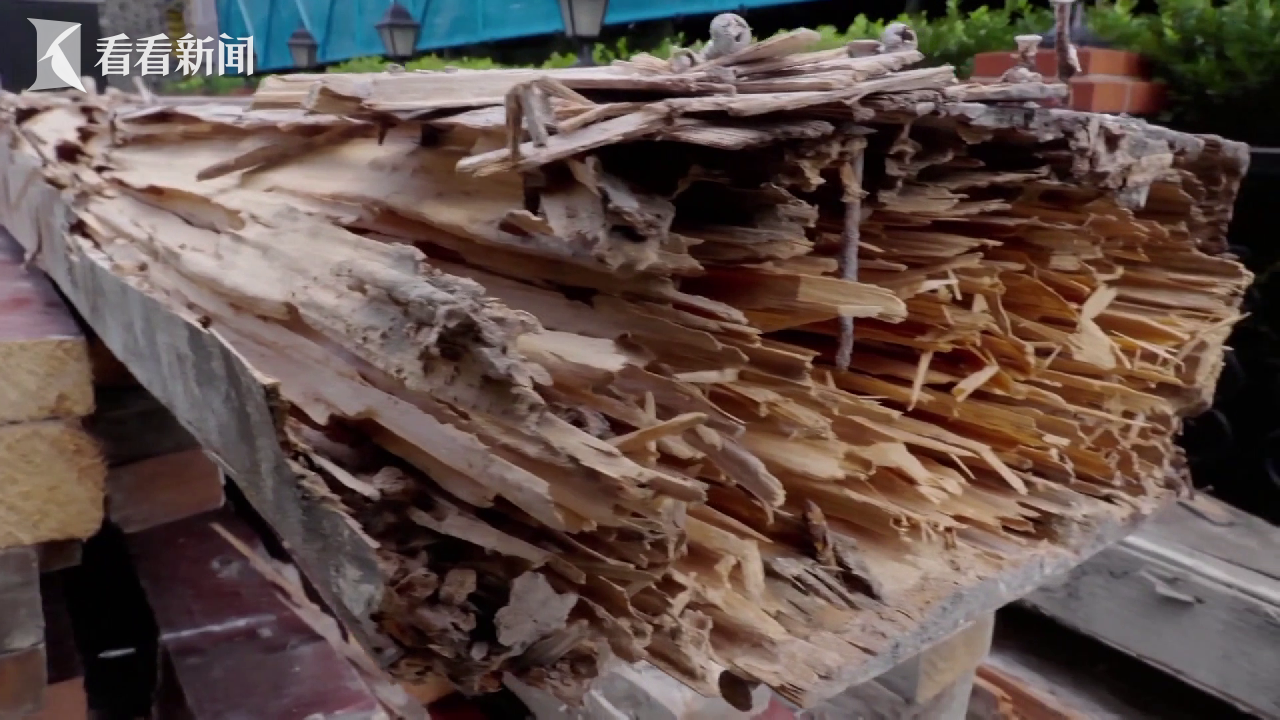 2025年10月,修繕工程正式重啟。施工團隊花了一個多月時間,從屋頂開始逐步拆卸被白蟻啃食的木構件?!斑@根是在一層東側的大梁,”施工方負責人陸偉指著拆下的木料說,“大家可以直觀地看到木料被白蟻蛀空的樣子,這些黃色的就是白蟻的通道?!?/p>