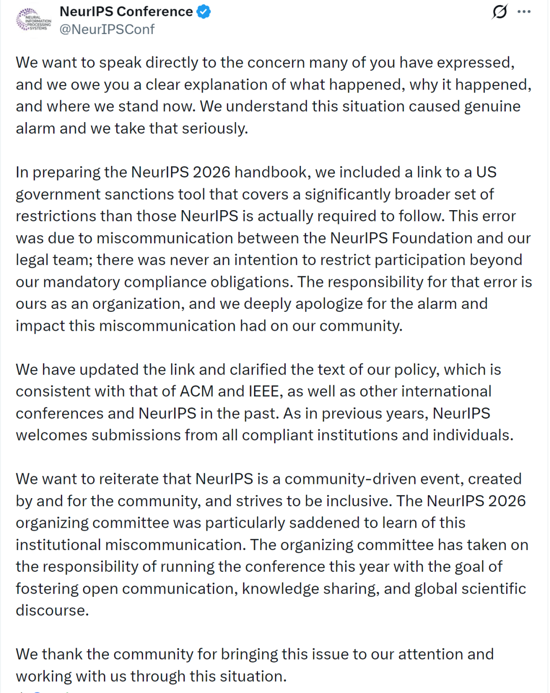 在中國(guó)科協(xié)和中國(guó)計(jì)算機(jī)學(xué)會(huì)連續(xù)發(fā)表抵制聲明后,NeurIPS認(rèn)錯(cuò)了,在其官方X上發(fā)布了聲明: