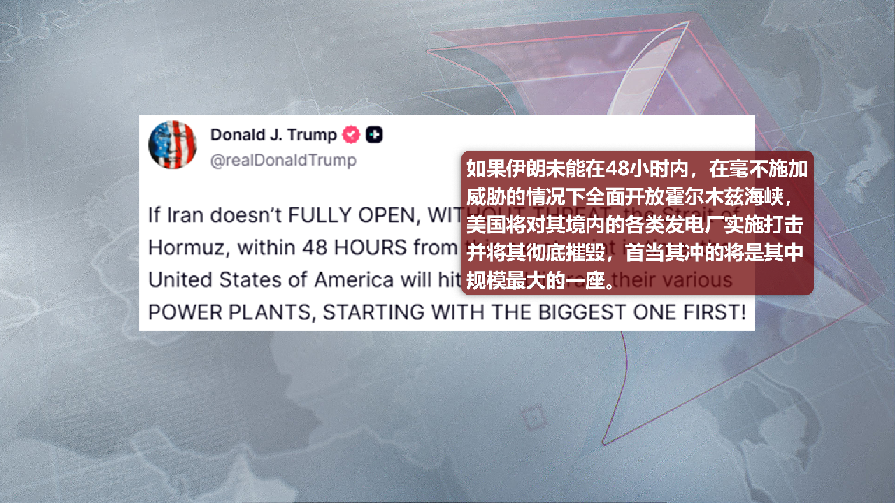 美國(guó)總統(tǒng)特朗普21日發(fā)文稱,如果伊朗未能在48小時(shí)內(nèi),不加威脅地完全開(kāi)放霍爾木茲海峽,美國(guó)將打擊并摧毀伊朗各類發(fā)電廠,首先是最大的那一座。