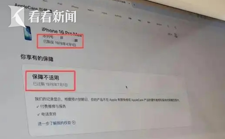 去年9月,江蘇蘇州的初二學(xué)生小金花費(fèi)8684元網(wǎng)購(gòu)了一臺(tái)iPhone 16 Pro Max。沒(méi)想到,這臺(tái)聲稱(chēng)“正品保障、官網(wǎng)可查”的手機(jī),卻在使用近半年后出現(xiàn)令她匪夷所思的情況:經(jīng)蘋(píng)果線下門(mén)店檢測(cè),該設(shè)備的激活信息顯示“購(gòu)買(mǎi)日期”為1978年4月1日。