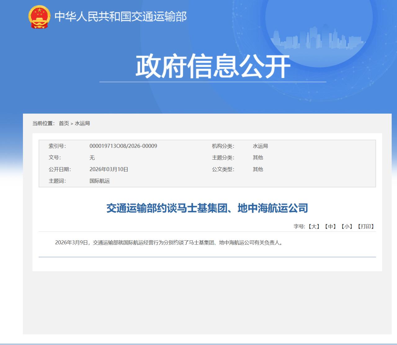 2026年3月9日,交通運輸部就國際航運經(jīng)營行為分別約談了馬士基集團、地中海航運公司有關負責人。